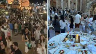 Efes Antik Kenti'nde "özel davet" krizi: Kütüphaneye alınmayan vatandaşlar tepki gösterdi, Örenyerini gezmeye başlayan ziyaretçiler, Celsus Kütüphanesi’ne geldiklerinde kütüphanenin bir barikat ile çevrildiğini özel bir şirketin Celsus Kütüphanesi’ndeki organizasyonu yüzünden alana alınmayınca durumu protesto etti.