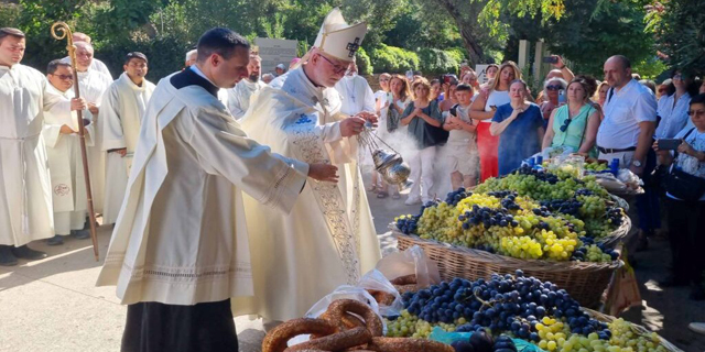 İlk olarak sabah saat 10:00’da Şapelden çıkarak Meryem Ana Evi’nin yakınındaki sarnıcın karşısında bulunan alana doğru giden tören alayı ile birlikte, turfanda üzüm ve incir ve de ekmek ve gevrek, İzmir Latin Katolik Başepiskoposu Mons. Martin Kmetec tarafından takdis edildi.