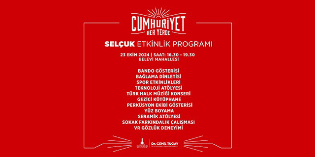 “Cumhuriyet Her Yerde” etkinlik programı kapsamında birbirinden farklı ve renkli etkinlikler düzenleniyor. İzmir Büyükşehir Belediyesi'nin düzenleyeceği etkinlikler arasında bando gösterisi, bağlama dinletisi, spor etkinlikleri, teknoloji atölyesi, Türk Halk Müziği konseri, gezici kütüphane, perküsyon ekibi gösterisi, yüz boyama, seramik atölyesi, sokak farkındalık çalışması ve VR gözlük deneyimi yer alacak.